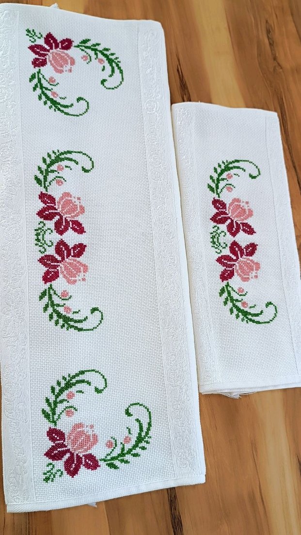 Kırmızı ve pembe tonlarında nakışlı çiçek desenlerine sahip beyaz havlular, geleneksel tarzda ve yumuşak dokuda. kişiye özel sipariş alıyorum.