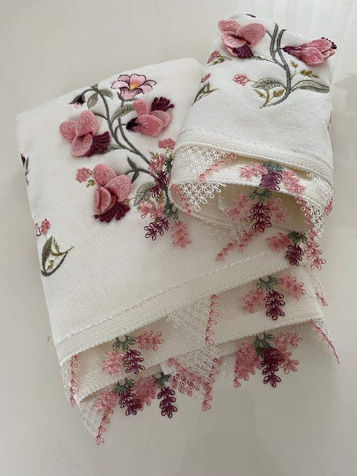 Beyaz havlu seti, pastel renklerde nakış ve dantel detayları ile geleneksel bir görünüm sunar.