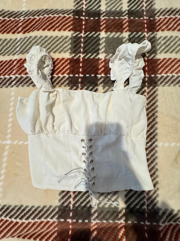 Nakışlı detaylara sahip, beyaz renkli, midi boy ve vücuda oturan hemşire korsesi. Fırfırlı askıları ve bağcıklı ön kısmı bulunur.