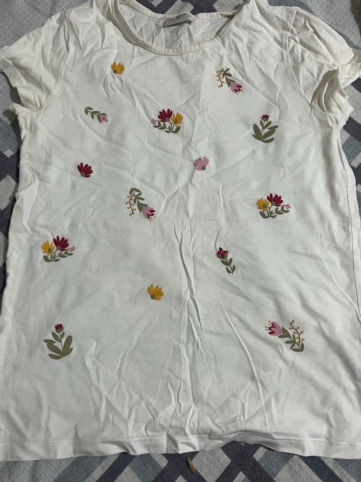 Nakışlı çiçek desenlerine sahip beyaz kadın tişörtü, kısa kollu ve düğmeli detaylıdır. Bol kesim, yuvarlak yaka ve bohem tarzıyla günlük kullanıma uygundur.