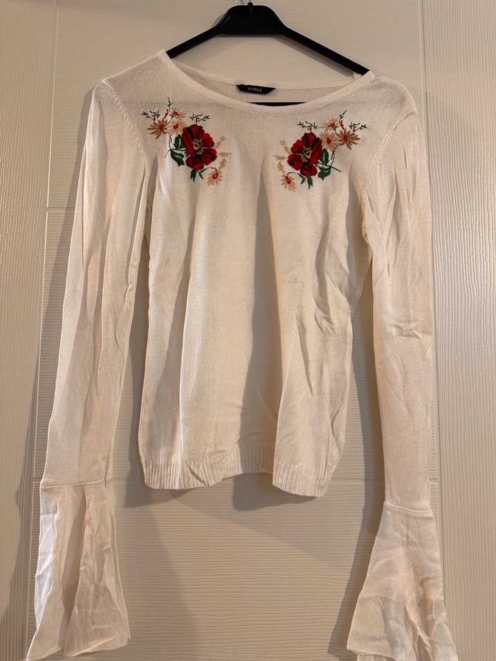 Bu beyaz bohem bluz, uzun kollu ve göğüste nakışlı çiçek detaylarına sahiptir. Pamuklu, örme dokulu ve bol kesimdir, günlük kullanım için uygundur.