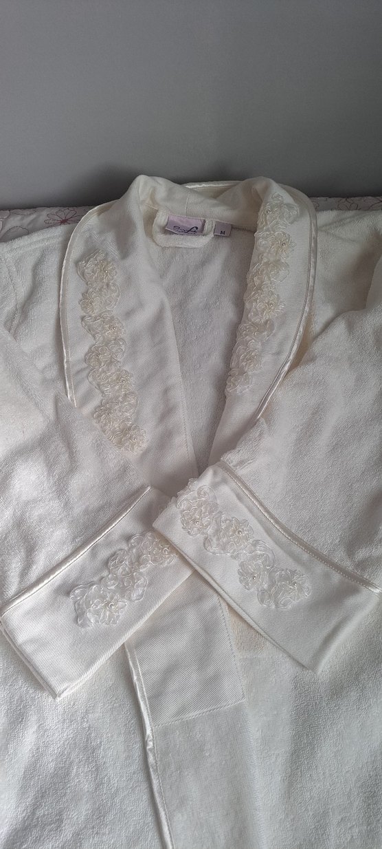 Nakışlı Beyaz Kadın Bornoz, Uzun Kollu, Rahat Kesim