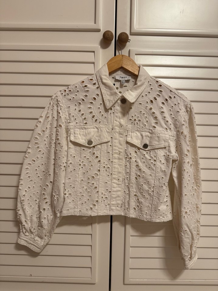Pamuklu kumaştan, düğmeli, uzun kollu, nakışlı beyaz kadın kot ceket. Salaş kesimli, notched lapel yakalı, günlük kullanıma uygun rahat stil. Bir kez kullandım, ölçüleri resimlerde mevcuttur.