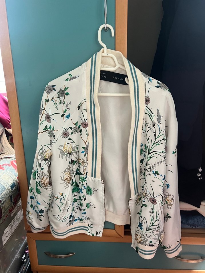Nakışlı çiçek desenli, düğmeli, straplez yaka ve uzun kollu beyaz kadın ceket. Rahat kesimli ve günlük kullanıma uygun.