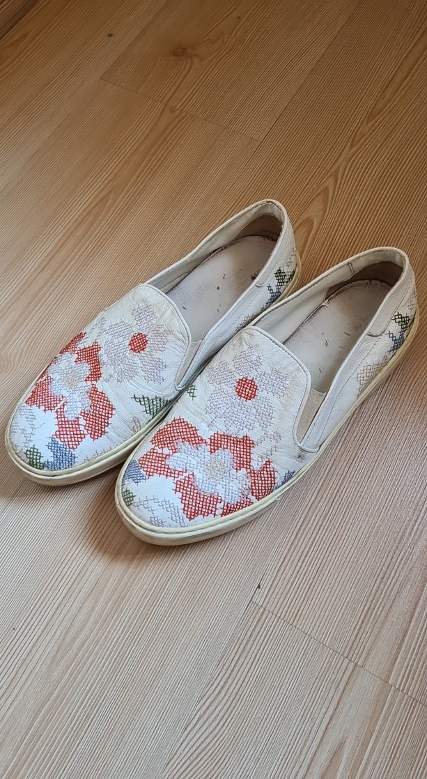 Nakışlı çiçek desenli beyaz espadriller, düz kauçuk tabanlıdır. Bohem ve minimalist tarzda, günlük kullanım için Velcro kapamalıdır.