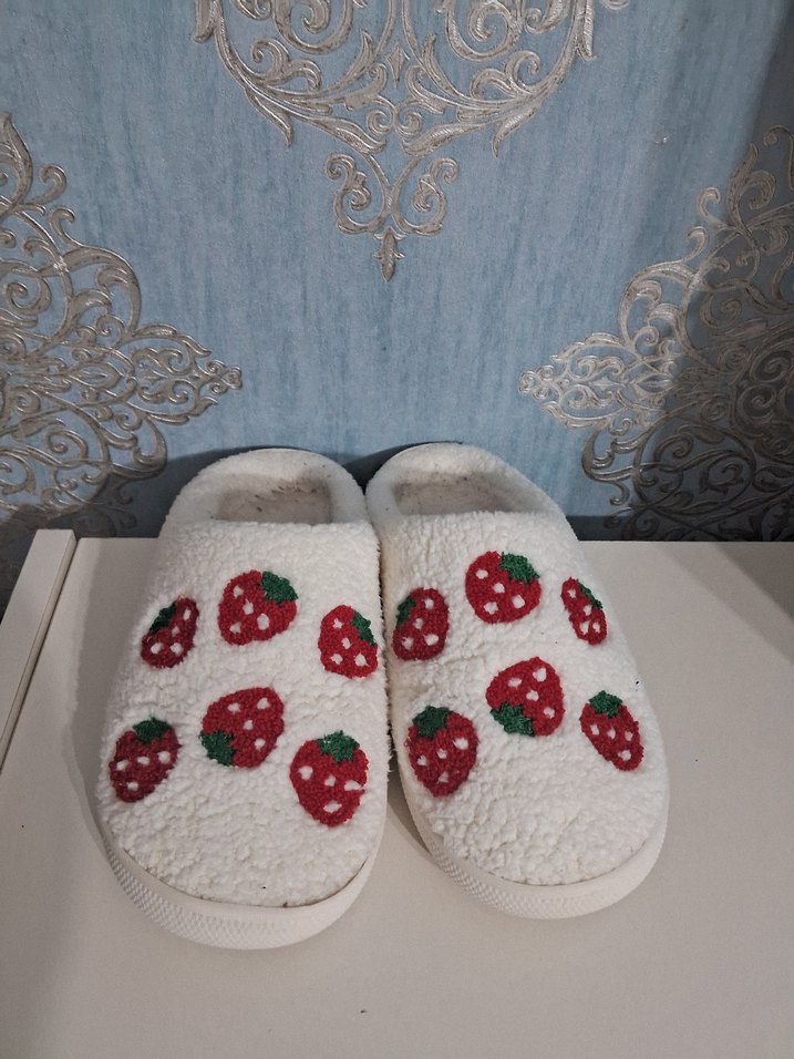 Nakışlı renkli çilek desenli, örgü beyaz kadın ev terliği. Sıcacık ve rahat, günlük kullanıma uygun.