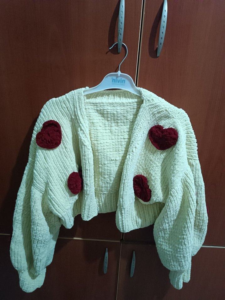 Uzun kollu, bol kesim beyaz örgü kadın mini hırka, kırmızı nakışlı kalp detaylarıyla süslenmiştir. Yuvarlak yakalı ve kısa boydadır. ❤️SİPARİŞ ÜZERE YAPILIR SATIN ALMADAN ÖNCE BOYUT VEYA FİGÜR BELİRTEBİLİRSİNİZ V YAKA SİMİT YAKA VE HER DESEN VE RENK MECUTTUR