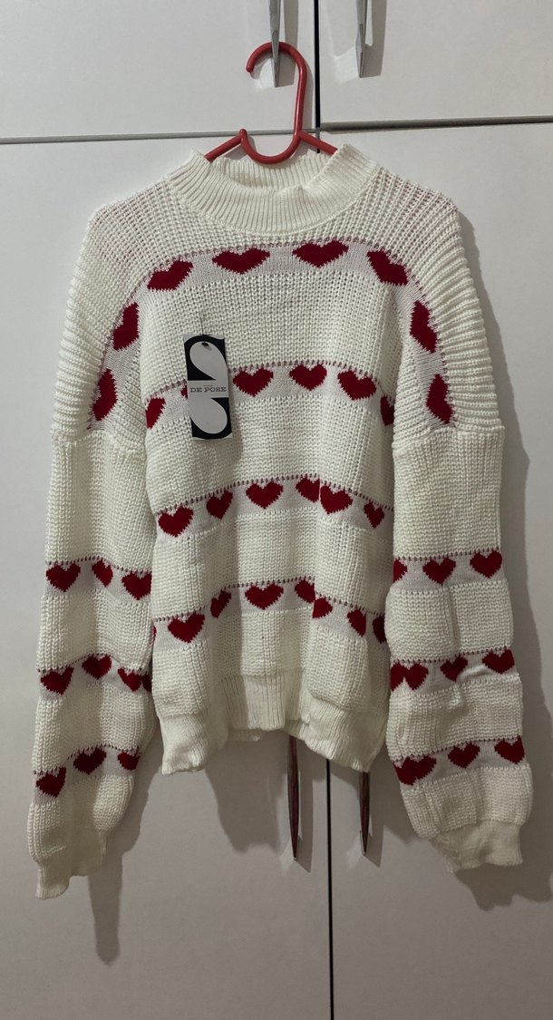 Bu beyaz örgü kazak, nakışlı kırmızı kalp desenleriyle uzun kollu ve bol kesimdir. Yuvarlak yaka ve normal midi uzunluğa sahiptir, günlük rahatlık için uygundur. ❤️