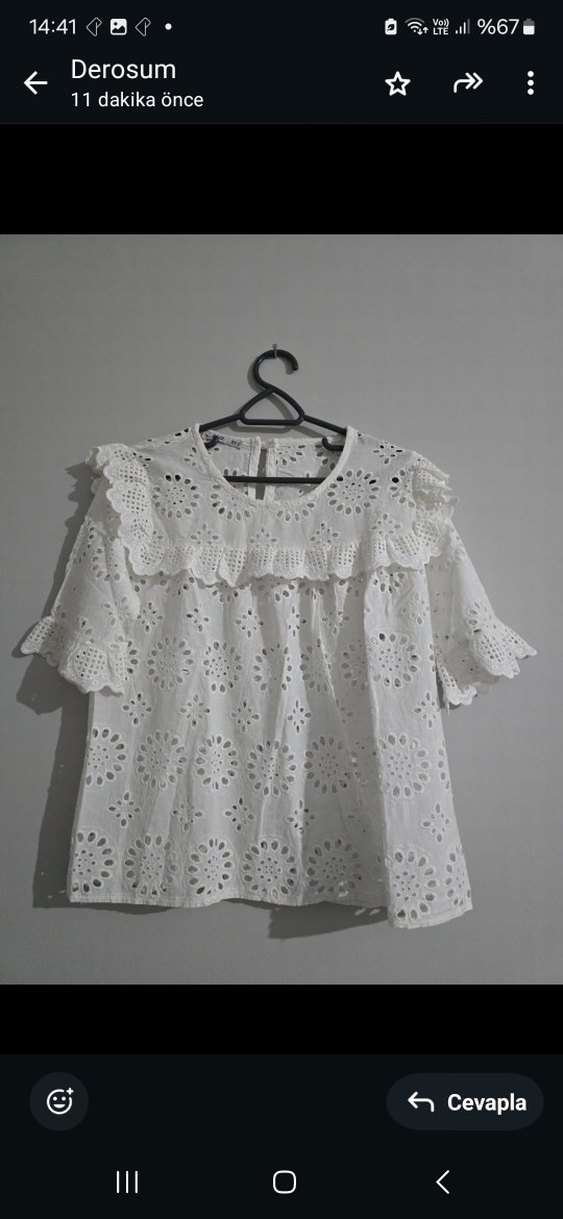 Nakışlı desenlere, fırfır detaylara ve kısa kollara sahip bol kesim beyaz pamuk bluz, yuvarlak yakalı bohem tarzda.