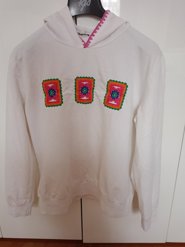 Beyaz, uzun kollu, kapşonlu, renkli nakışlı kadın örme sweatshirt. Rahat kesim ve sokak stili, konforlu bir tasarım sunar. 42-44 bedene uygundur.