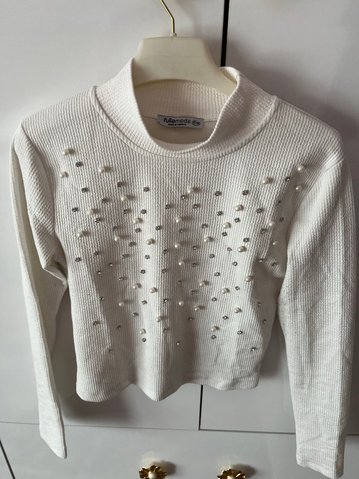 Dar kesim beyaz triko kazak, uzun kollu ve yuvarlak yakalıdır. Ön kısmında nakışlı inci detaylarıyla süslenmiş, kısa boyuyla trend sokak stiline uygundur. ❄️