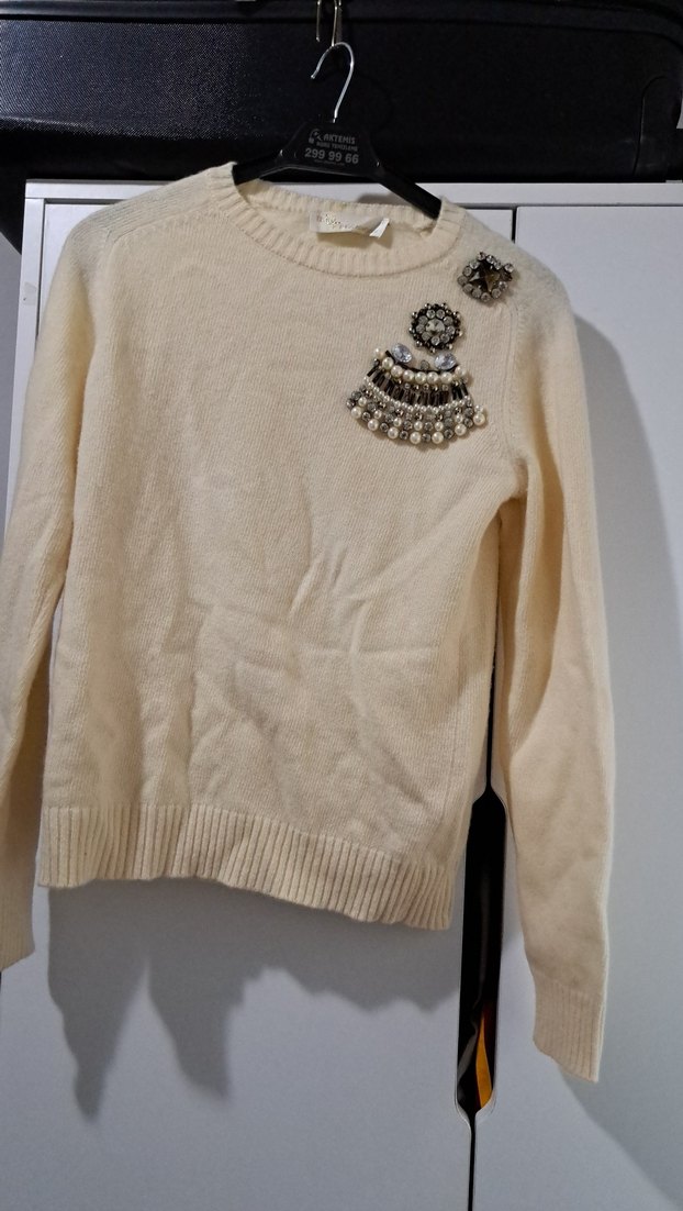 Beyaz triko kazak, yuvarlak yaka ve uzun kollu, bol kesim olup nakış detaylarıyla bohem tarzı yansıtır. Günlük kullanım için uygundur.