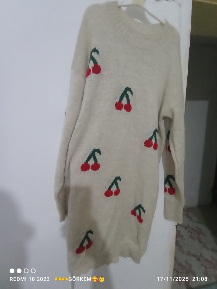 Bu beyaz triko kadın kazak, bol kesim ve nakışlı kiraz desenlerine sahiptir. Uzun kollu ve yuvarlak yakalıdır, rahat ve şık bir günlük kullanım parçasıdır.