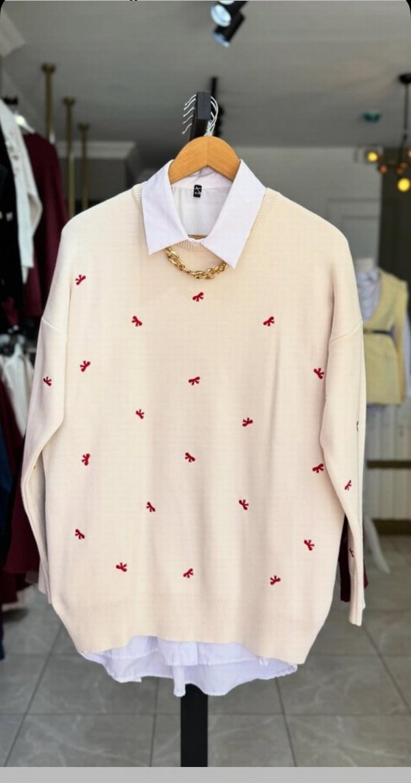 Bu beyaz triko kazak, yuvarlak yaka ve uzun kolludur. Gevşek kesimi ve küçük kırmızı nakış detaylarıyla rahat ve şık bir görünüm sunar. Kısa boyu farklı kombinlerle uyumludur.