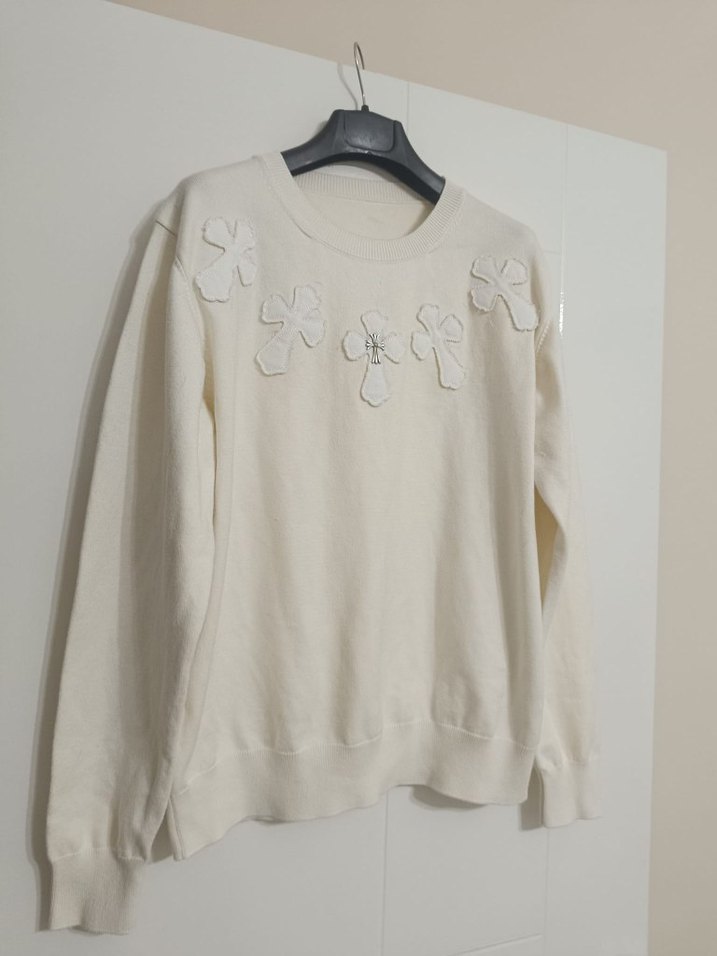 Kadınlar için beyaz triko kazak, yuvarlak yaka ve uzun kolludur. Ön kısmında nakış detayları bulunan rahat kesimli, günlük sokak stiline uygun bir parçadır.