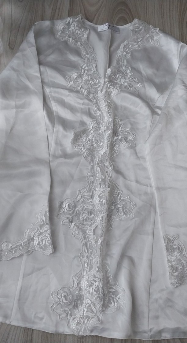 Nakışlı ve uzun kollu, vintage tarzda beyaz uzun boy kadın pijama ve sabahlık önde ve kollarda detaylı işlemelere sahiptir.