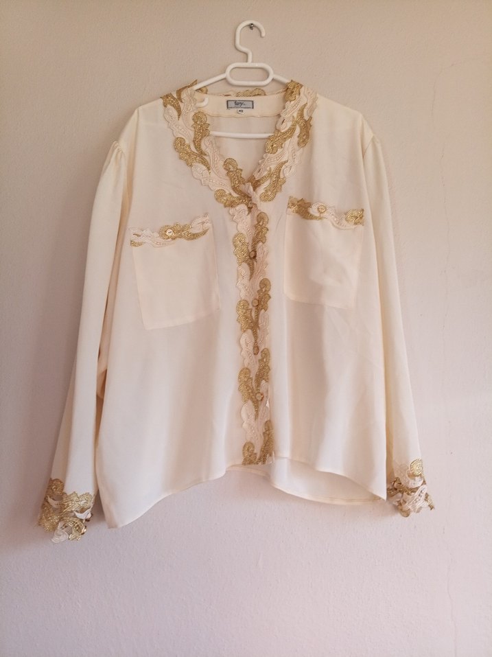 Bu beyaz, bol kesim gömlek uzun kollu ve V yakalıdır. Ön, manşet ve ceplerde zarif nakışlar bulunur. İpeksi kumaştan yapılmış, parlak ve vintage tarzda, ofise uygundur. Önü düğmelidir. ✨