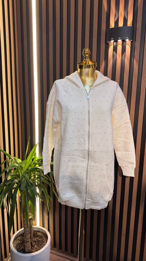 Uzun kollu, kapüşonlu ve fermuarlı beyaz sweatshirt. Yumuşak kumaştan, nakışlı detaylı ve rahat kesimlidir.