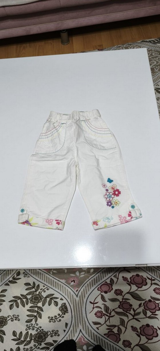 Renkli nakış detaylı, kemerli beyaz pamuklu kız çocuk pantolonu, rahat ve salaş kesimle sokak stiline uygun.