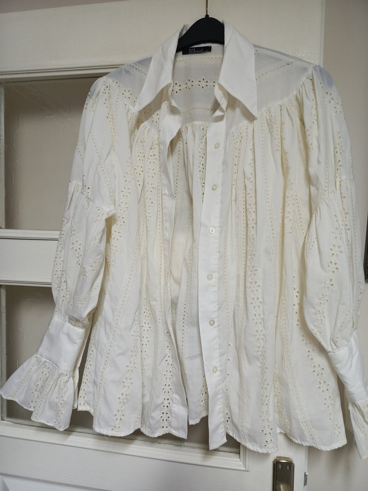 Nakışlı detaylara sahip, bol kesim, uzun kollu beyaz keten gömlek. Yaka ve düğmeli ön kısmı ile günlük kullanıma uygun bohem tarz.fisto gömlek bı kere giydim