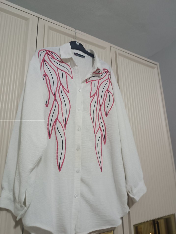 Uzun kollu, V yaka ve düğmeli beyaz keten gömlek. Kırmızı nakış detaylarıyla bohem tarzını yansıtır. Rahat ve bol kesimdir.