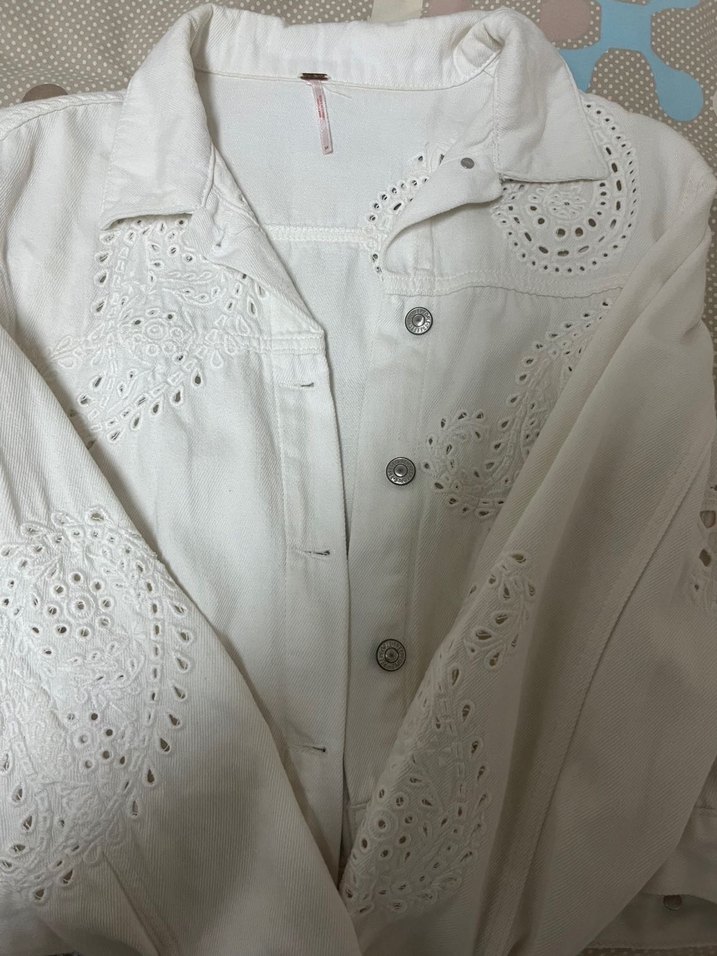 Nakışlı desenlere sahip beyaz keten gömlek, yakası çıtçıtlı ve düğmeli. Uzun kollu, bol kesim bohem tarzında, günlük kullanıma uygun.