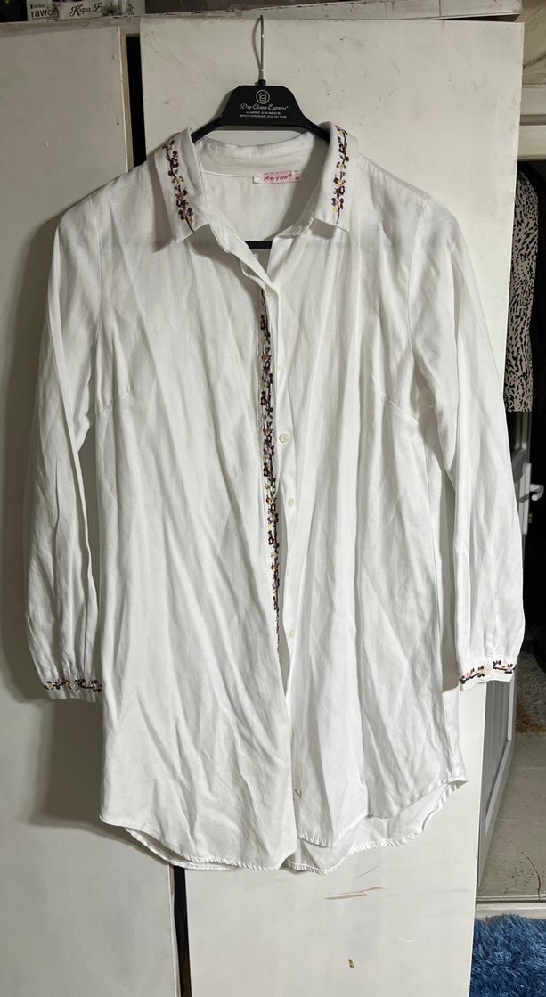 Uzun kollu, yakalı ve düğmeli bu bol kesim kadın gömleği, yumuşak keten kumaştan yapılmıştır. Yaka, düğme hattı ve manşetlerde nakış detayları bulunmaktadır. Bohem tarzını yansıtan midi boyda, gri tonlu beyaz renktedir.