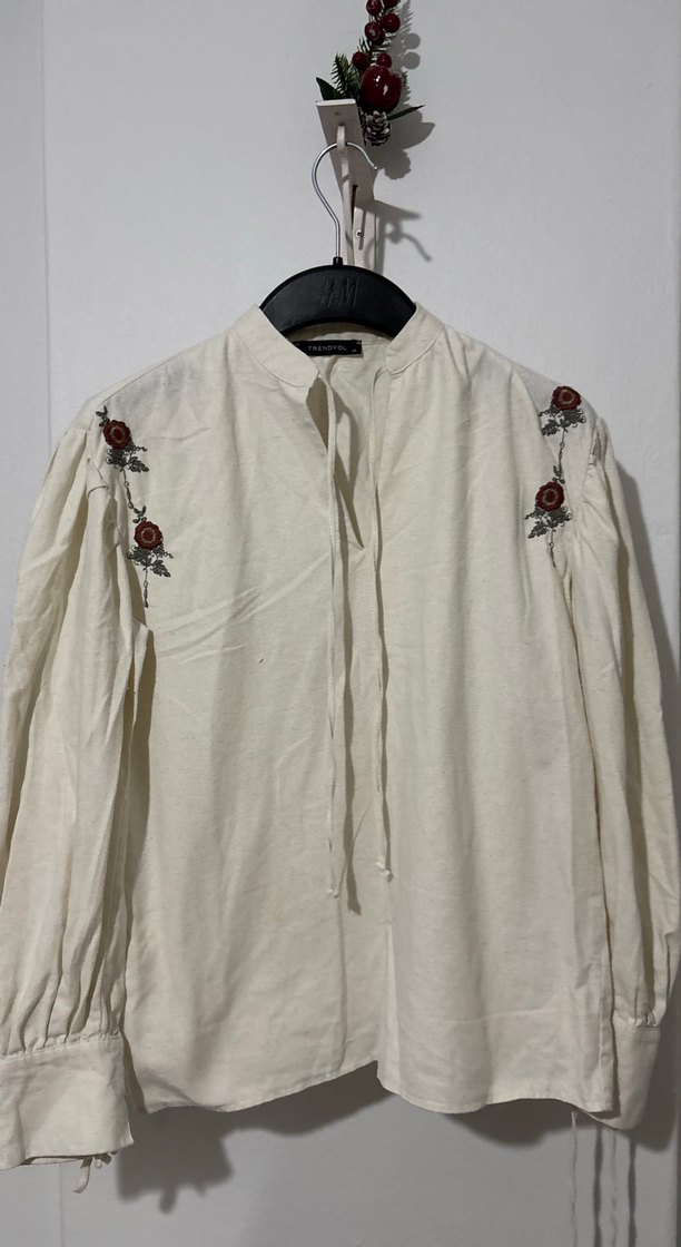 Uzun kollu, bol kesim beyaz keten gömlek. Omuzlarda zarif nakış detayları, düğmeli ve yakalı bohem tarzda günlük kullanıma uygun.
