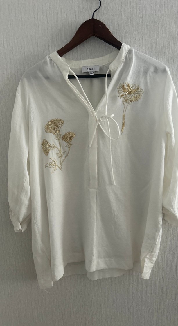 Nakışlı çiçek desenli, uzun kollu, keten beyaz gömlek. V yaka ve düğmeli, bohem tarzını yansıtır, günlük kullanıma uygundur.