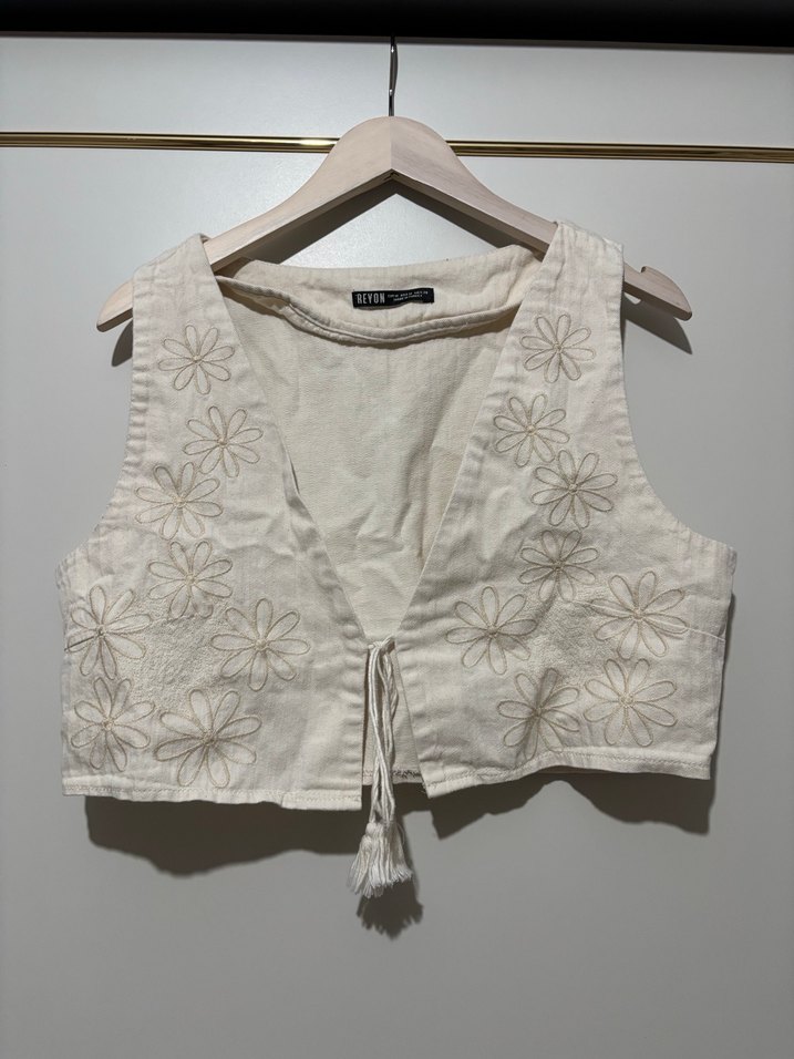 Nakışlı çiçek desenli, düğmeli, askısız yaka ve kısa kesim beyaz keten bohem tarzı yelek. Rahat ve salaş kesim. Sorunsuz