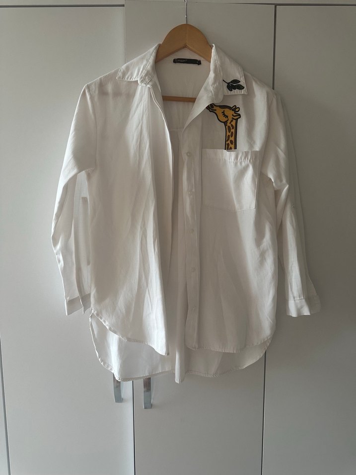 Nakışlı detaylara sahip, yakalı ve düğmeli beyaz keten gömlek. Uzun kollu, bol kesim, günlük kullanıma uygun.