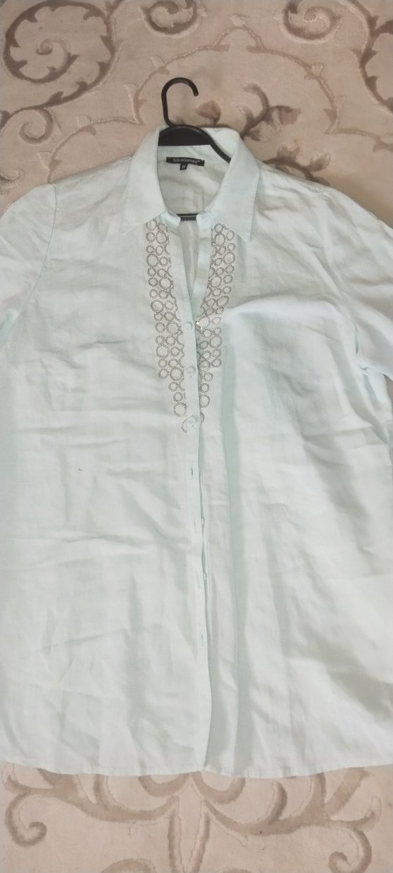 Nakışlı detaylara sahip beyaz keten gömlek, yakalı ve düğmeli tasarıma sahiptir.llu, bol kesim ve midi boyda, bohem tarzını yansıtır.
