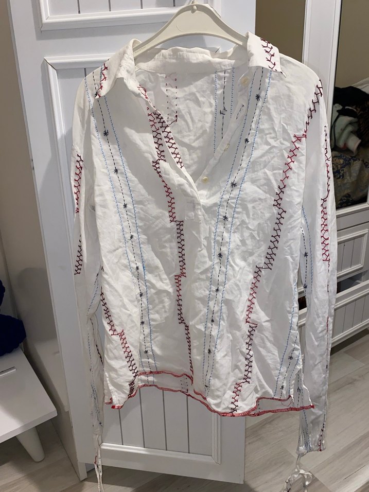Nakışlı desenlere sahip, uzun kollu, beyaz keten gömlek. Bohem tarzını yansıtan yakalı ve düğmeli tasarım.