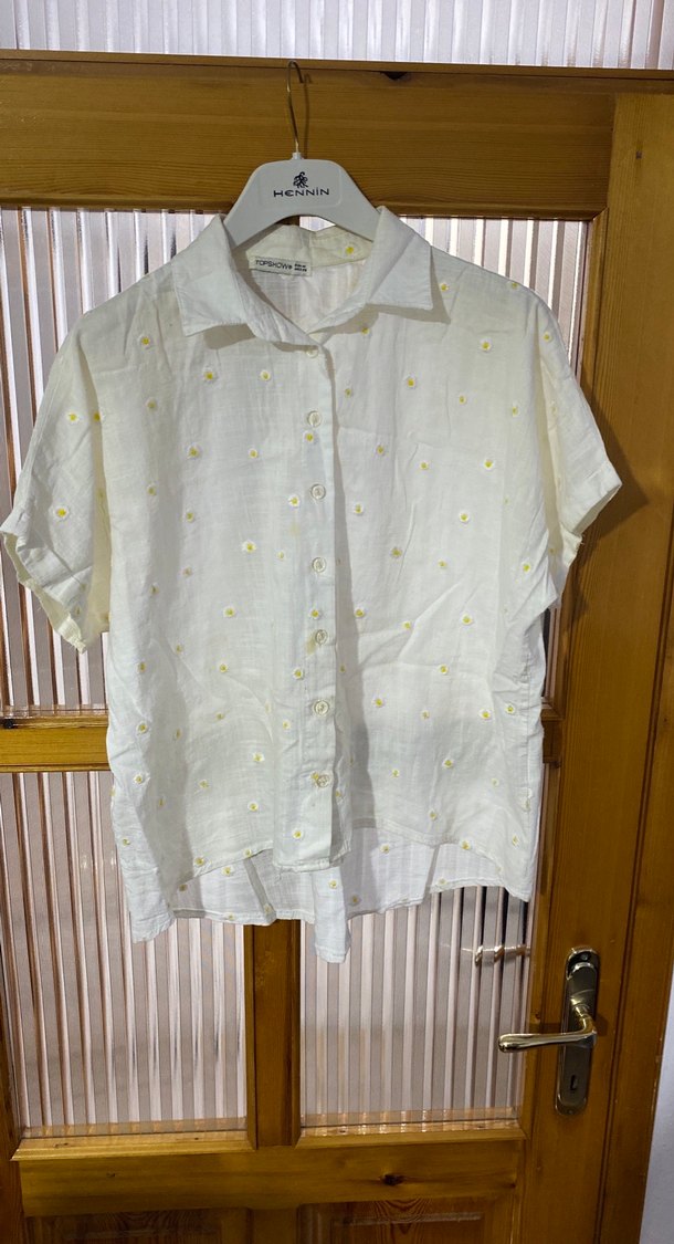 Bu beyaz keten kadın gömlek, kısa kollu, yakalı ve düğmeli. Bol kesimi ve nakış detaylarıyla bohem tarzı sunar. Günlük kullanıma uygun.