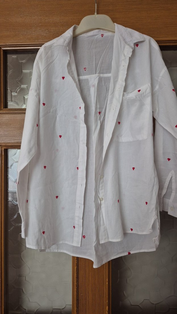 öksüz kollu, keten kumaştan, düğmeli ve notalı yakalı beyaz gömlek. Minimalist bohem tarzda kırmızı nakış detayları bulunur.