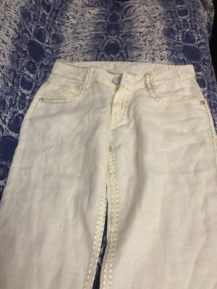 Nakışlı detaylar ve dantel süslemeli beyaz keten kadın pantolon, bohem tarzda normal boy ve rahat kesim.