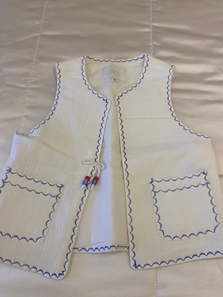 Nakışlı kenar detayları ve kesik yaka ile beyaz keten kadın yelek. Düğmeli önü ve iki cep bulunur. Bohem tarzda, günlük kullanıma uygun.