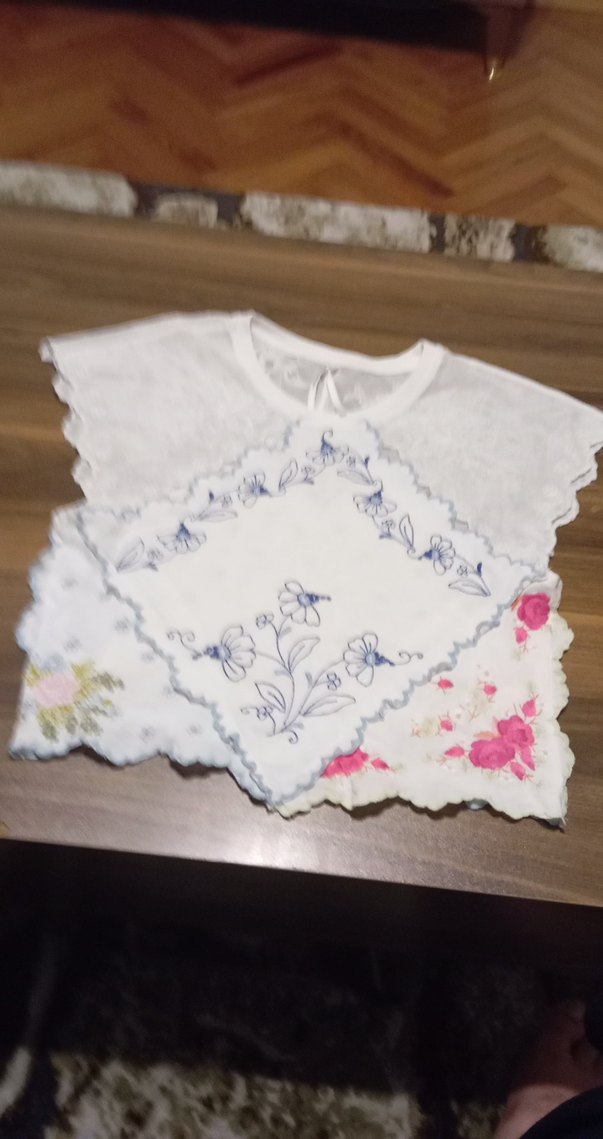 Pastel renklerde nakışlı çiçek desenleriyle beyazYumuşak kumaş ve dalgalı kenarlar içerir.