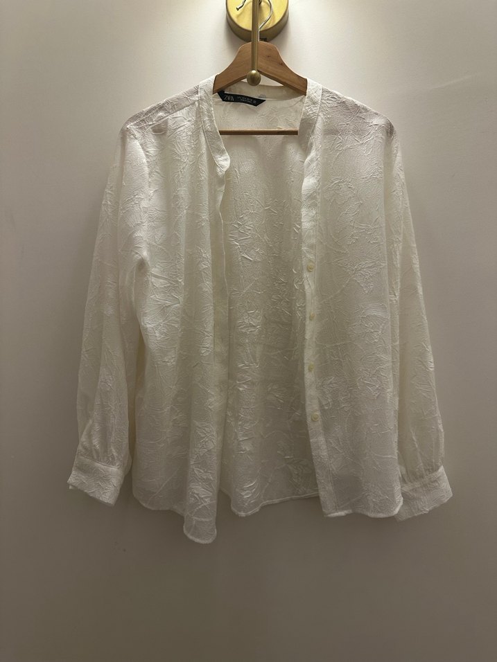 Uzun kollu, V yaka, nakışlı beyaz keten gömlek. Bol kesim ve düğmeli, bohem tarzıyla günlük kullanıma uygun. Zara markasıdır