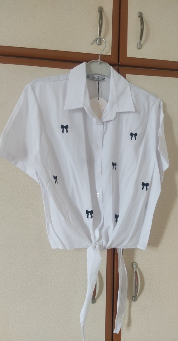 Pamuklu, kısa kollu, yakalı ve düğmeli beyaz gömlek. Nakışlı fiyonk desenli, bol kesim ve ön bağlamalı, günlük rahat stil için uygun.