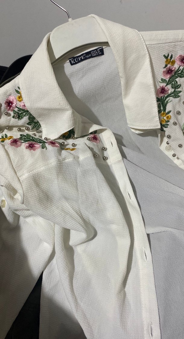 Nakışlı çiçek desenleri ve inci detayları bulunan beyaz gömlek, kısa kollu ve yakalıdır. Düğmeli, kısa ve regular fit kesimdedir. Bohem tarzıyla günlük kullanıma uygundur.
