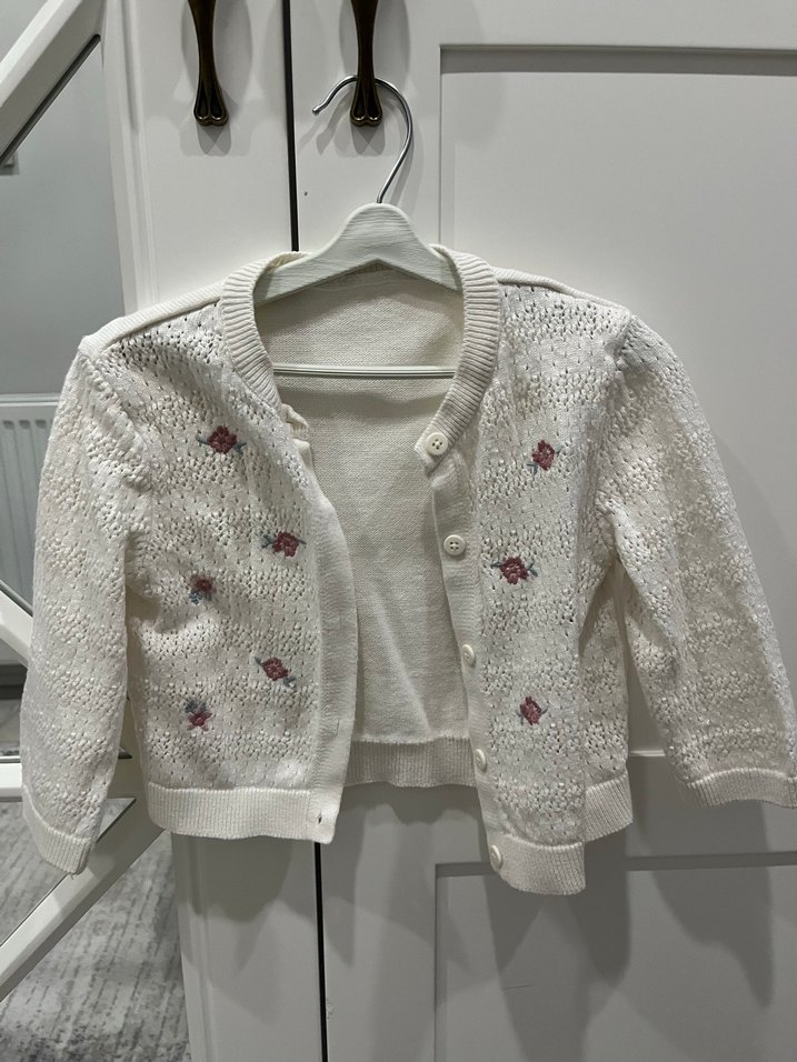 Nakışlı çiçek desenli, uzun kollu, beyaz kısa örgü hırka. Bohem sokak stili ve yakalı kesimi ile günlük kullanıma uygun. 9.12 ay uyumlu
