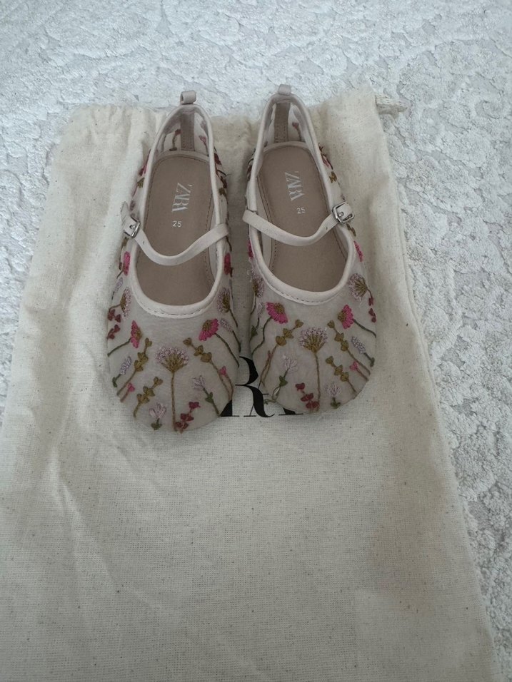 Nakışlı çiçek desenleri ve ince dantel detaylarıyla beyaz kız babetleri, yumuşak sentetik kumaştan üretilmiştir. Pastel renkler bohem tarzı tamamlar.