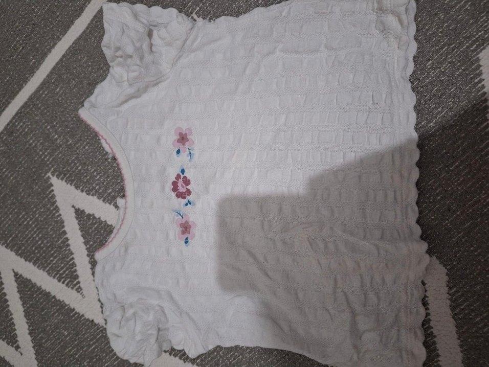 Beyaz kız bluzu, kısa kollu ve kayık yaka. Yumuşak pamuktan, nakışlı ve bol kesimli, fırfır detaylı bohem tarzda.