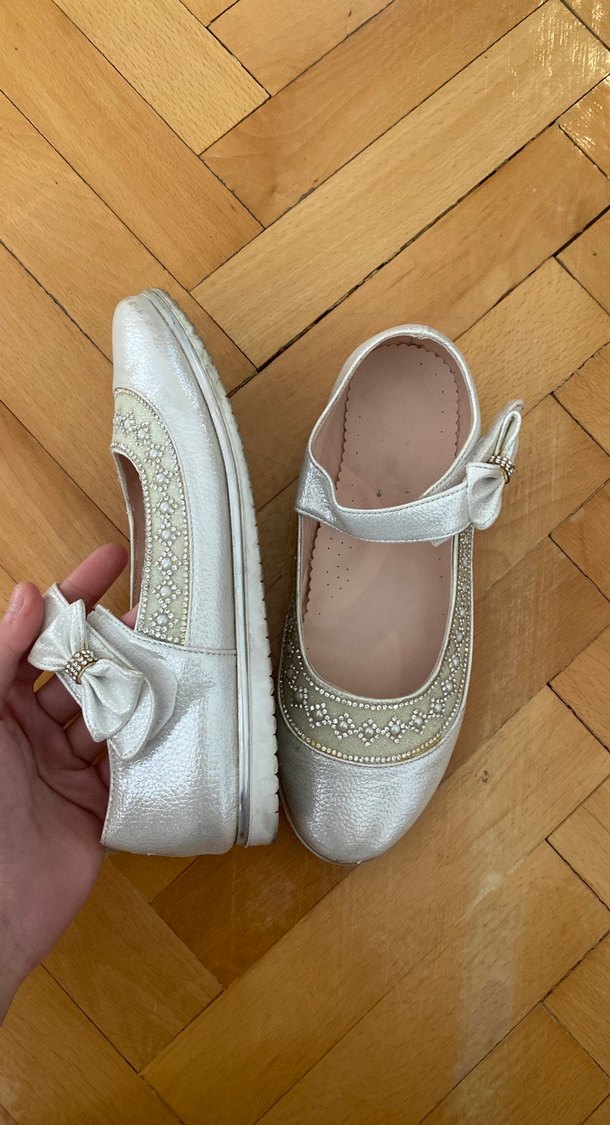 Beyaz renkli kız çocuk babet ayakkabılar, nakış detayları ve şık fiyonk süsü ile modern klasik tarz sunar. Kauçuk tabanlıdır.
