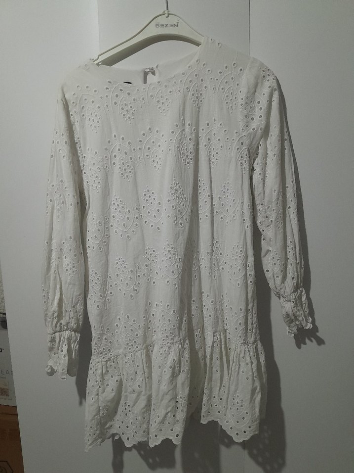 Beyaz kız çocuk bluzu, uzun kollu ve bol kesimdir. Keten kumaştan yapılmış, nakışlı desenler ve fırfır detayları vardır. Yuvarlak yaka ve bohem tarzını yansıtır.