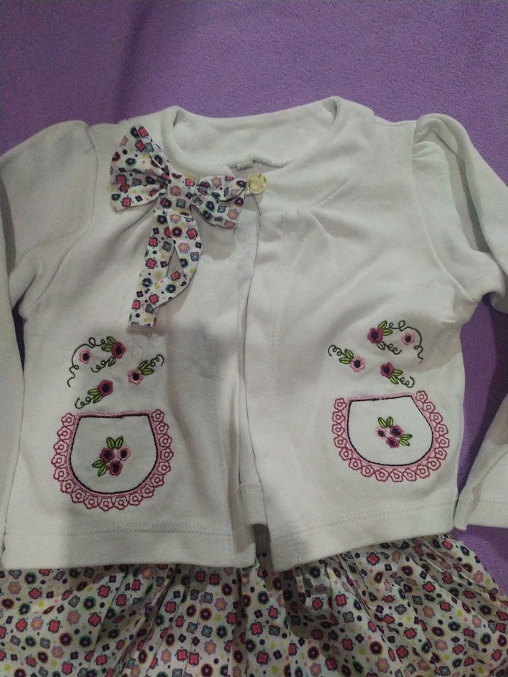 Nakışlı çiçek desenli, düğmeli, uzun kollu beyaz kız çocuk bolero, bol kesim ve yuvarlak yakalı. 2 adet takım beyazlı etiketinde 3 yazıyor 2 yasa olur