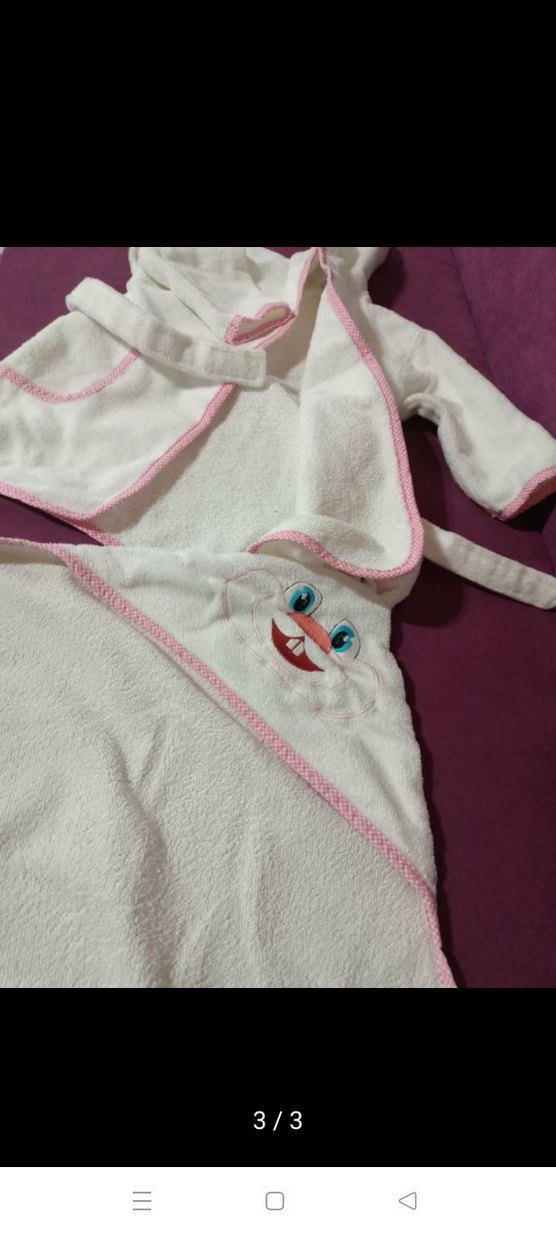 Yumuşak kumaştan yapılmış, pembe kenarlıklı kapüşonlu bornoz ve nakışlı detaylı havlu seti. Havluda eğlenceli yüz işlemesi bulunur.