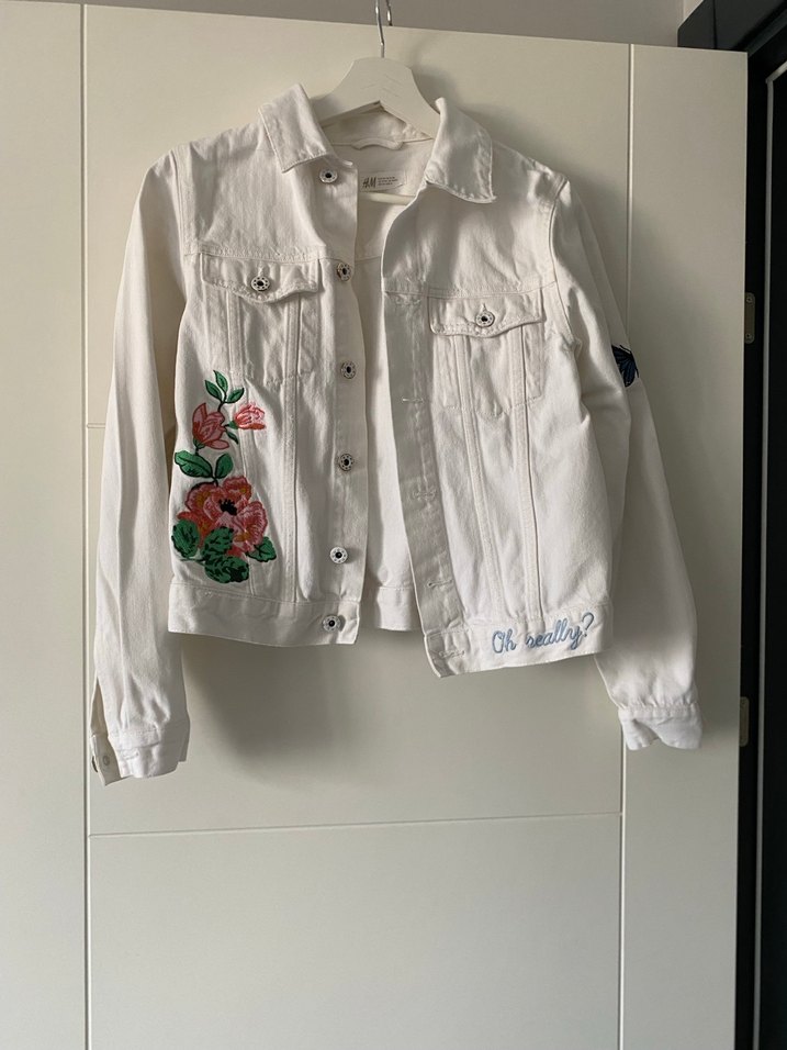 Düğmeli, nakışlı beyaz denim ceket. Uzun kollu, normal boyda ve bol kesim. Günlük sokak modasına uygun rahat bir tasarım.