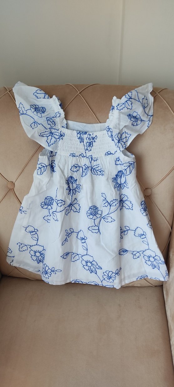 Mavi çiçek nakışlı beyaz pamuklu elbise, straplez yaka, fırfırlı kolsuz ve bol kesim. Bohem tarz için uygundur.